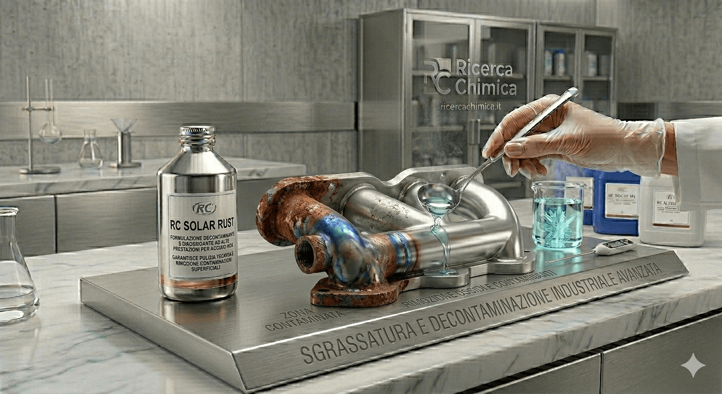 RC SOLAR RUST è la formulazione decontaminante e disossidante ad alte prestazioni sviluppata da Ricerca Chimica Group per il trattamento completo dell’acciaio inox.